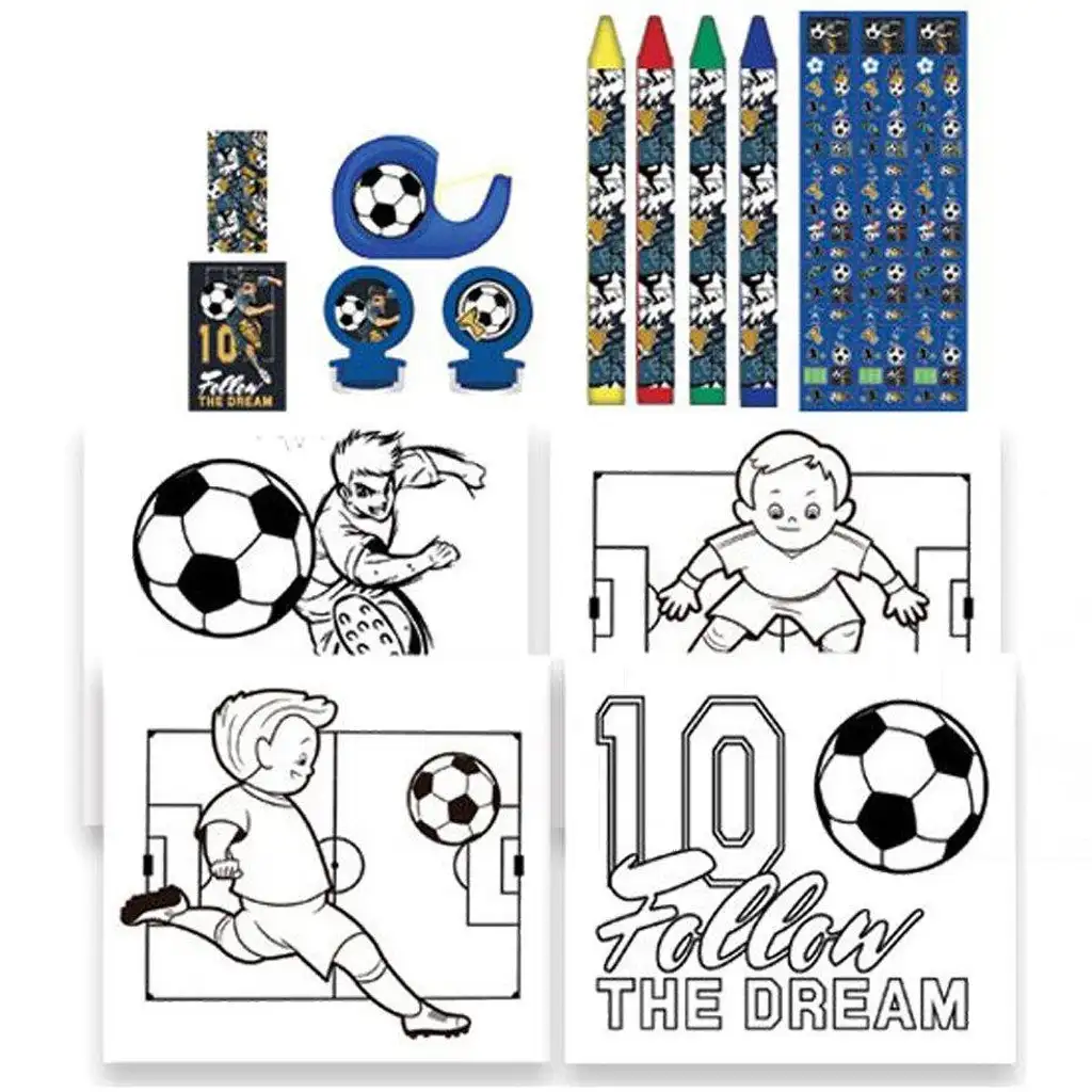 L’elemento centrale del set è un album da colorare a spirale con una copertina sportiva a tema calcio, completato da 4 pastelli a cera dai colori vivaci (giallo, rosso, verde, blu). Nel pacchetto troverai anche una gomma, un temperino, un dispensatore di nastro decorativo, dei timbri calcistici e degli adesivi alla moda, con cui i piccoli appassionati potranno decorare ulteriormente le loro creazioni. Le pagine da colorare raffigurano diverse scene calcistiche: tiri in porta, esultanze dopo un gol e parate spettacolari – tutto ciò che può accadere in campo ora prende vita in modo creativo.