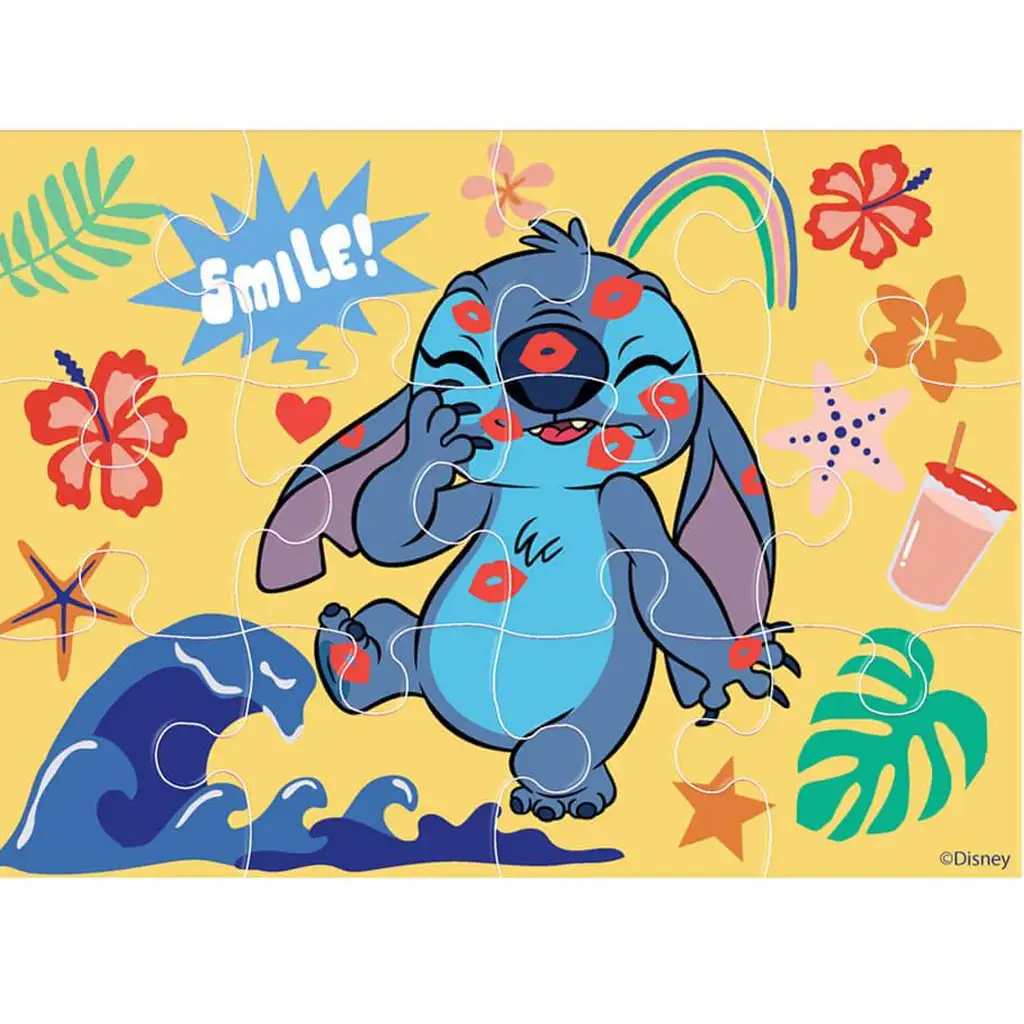 Nella scatola si trovano quattro puzzle diversi: uno da 12, uno da 15, uno da 20 e uno da 24 pezzi. Questa varietà è eccellente per aiutare a sviluppare la motricità fine, il riconoscimento delle forme e la concentrazione già a partire dai 3 anni. I colori vivaci dei puzzle, l’atmosfera tropicale e il sorriso dolce di Stitch cattureranno sicuramente l’attenzione dei bambini.