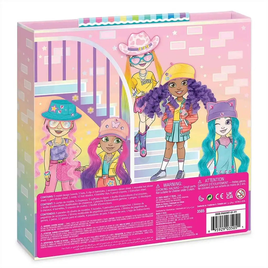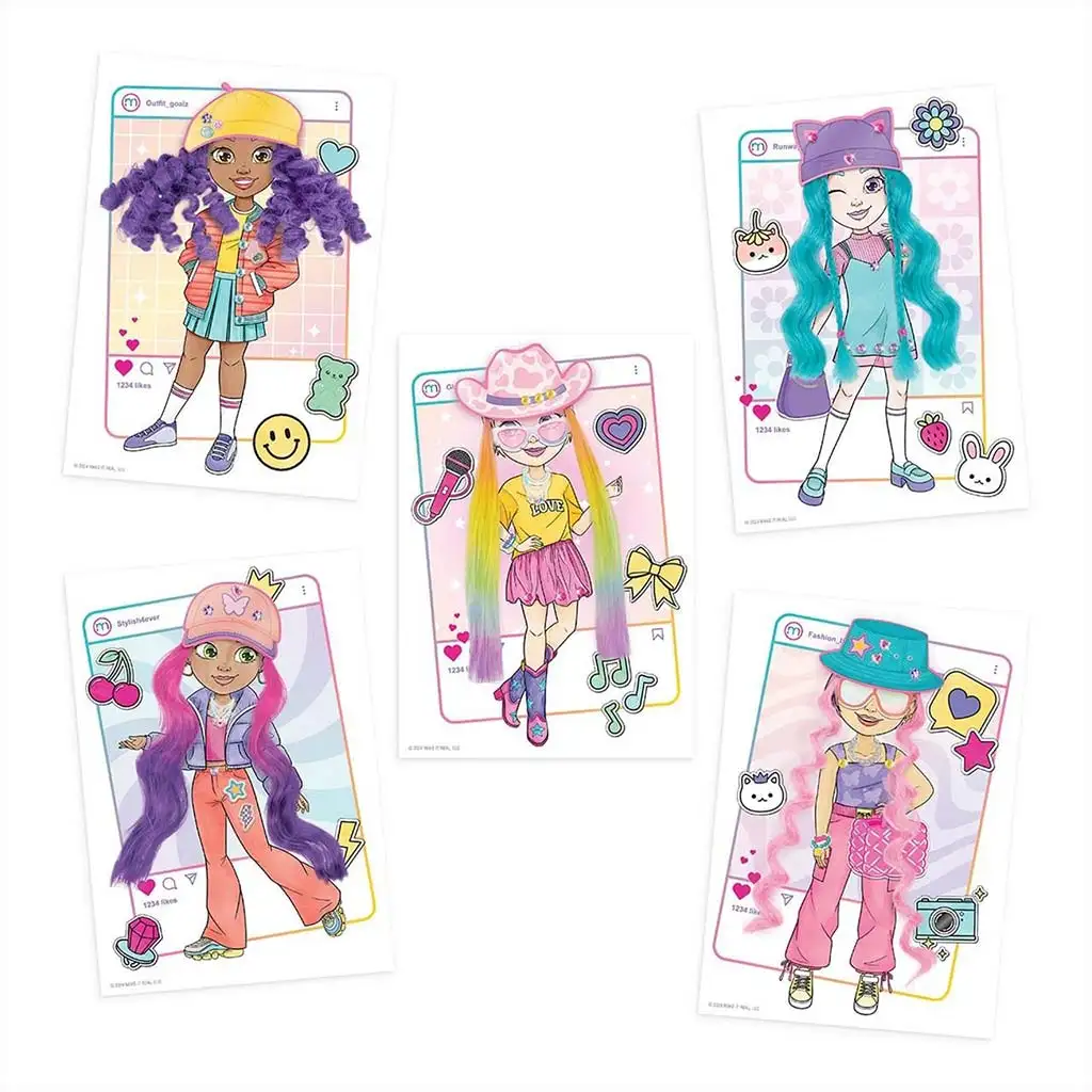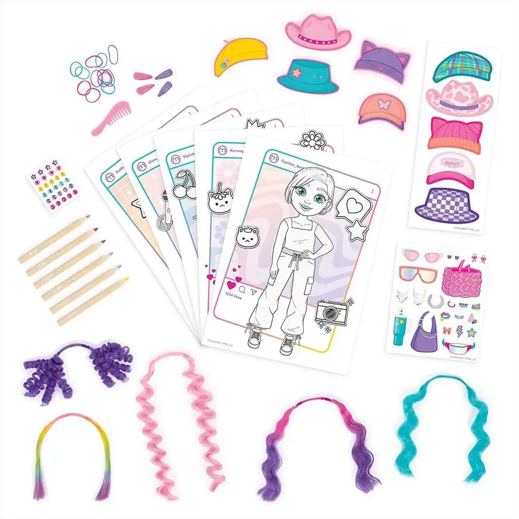 Il set include 5 fogli modello diversi, che possono essere personalizzati con le matite colorate, gli adesivi e gli accessori inclusi. L’esperienza diventa davvero unica grazie alle ciocche di capelli colorate intercambiabili, che si possono applicare alle figure per provare nuove acconciature. Con cappelli, occhiali da sole, borse e altri accessori alla moda, ogni creazione può avere uno stile diverso – da quello sportivo a quello bohémien o persino stravagante.