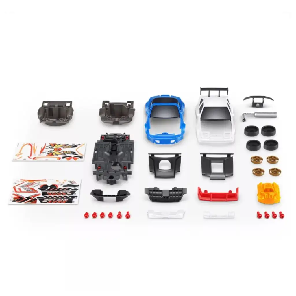 La confezione contiene: telaio, motore, 4 ruote, 2 carrozzerie, slime, adesivi