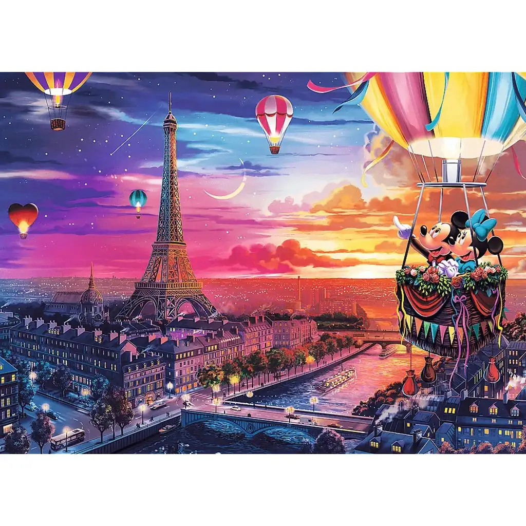 Lascia che Mickey e Minnie ti trasportino nella città dell’amore con questo meraviglioso puzzle da 1000 pezzi! Il puzzle “Disney – Mickey e Minnie a Parigi” raffigura una magica serata nella città delle luci: la coppia attraversa il cielo in mongolfiera alla luce del tramonto, mentre sotto di loro risplendono i magnifici edifici di Parigi lungo la Senna, tra cui la Torre Eiffel. L’immagine è caratterizzata da colori caldi e accoglienti, ricca di palloncini, stelle e un’atmosfera fiabesca.