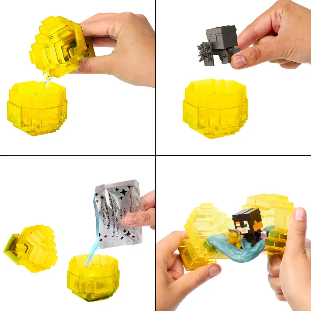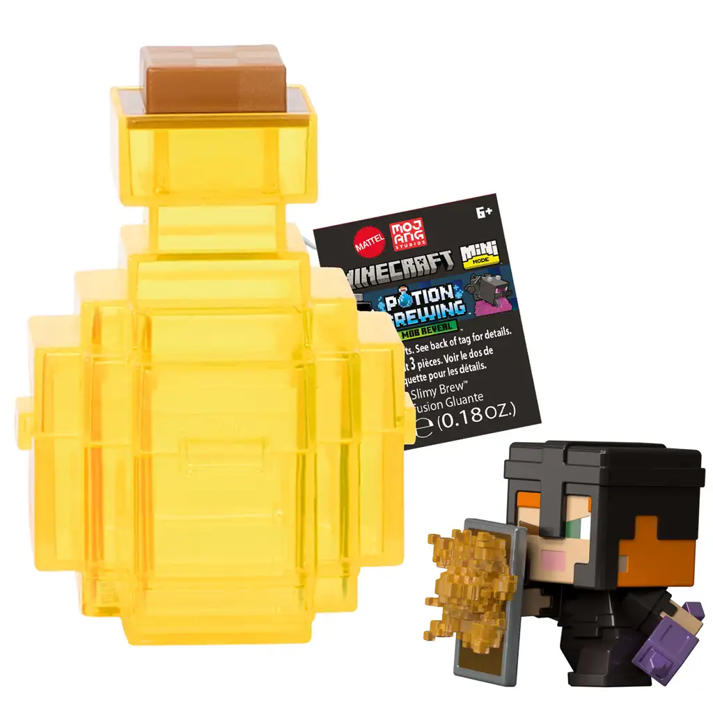 Il set include un contenitore trasparente a forma di bottiglia di pozione in stile Minecraft, una figura segreta e una dose di polvere slime Potion Particles. Basta aggiungere acqua nel contenitore, versare la polvere, agitare bene – e la magia ha inizio! La figura, inizialmente monocolore e grigia, rivelerà tutto il suo splendore man mano che la combinazione di slime e acqua ne mostra i veri colori e dettagli.