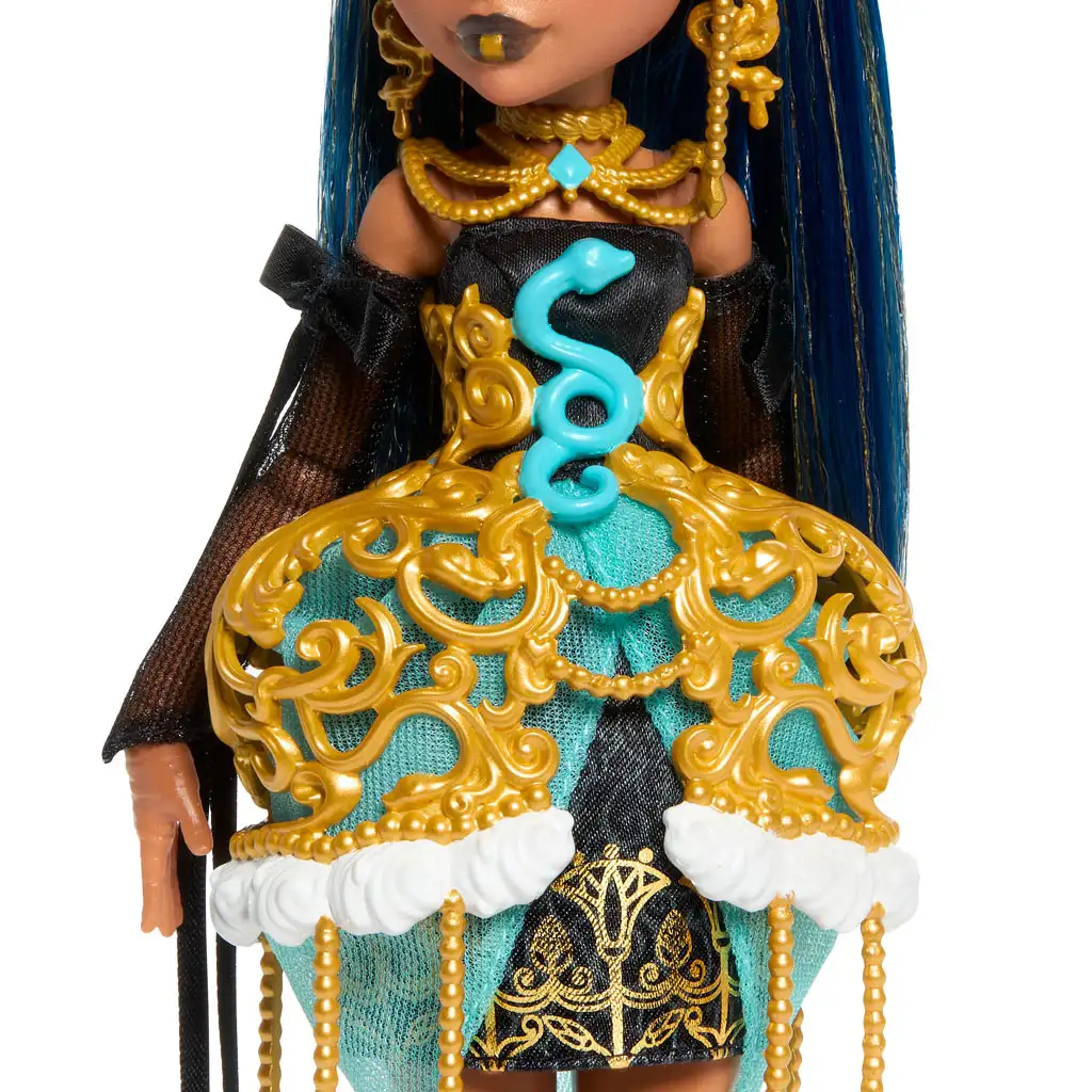 Gli studenti di Monster High sono pronti per la festa più spettrale di tutte, perché stanno celebrando il 1600° compleanno di Draculaura! Naturalmente, Cleo De Nile non può mancare al divertimento – anzi, è proprio lei la regina della festa in questo look sorprendente, degno di una principessa egiziana.