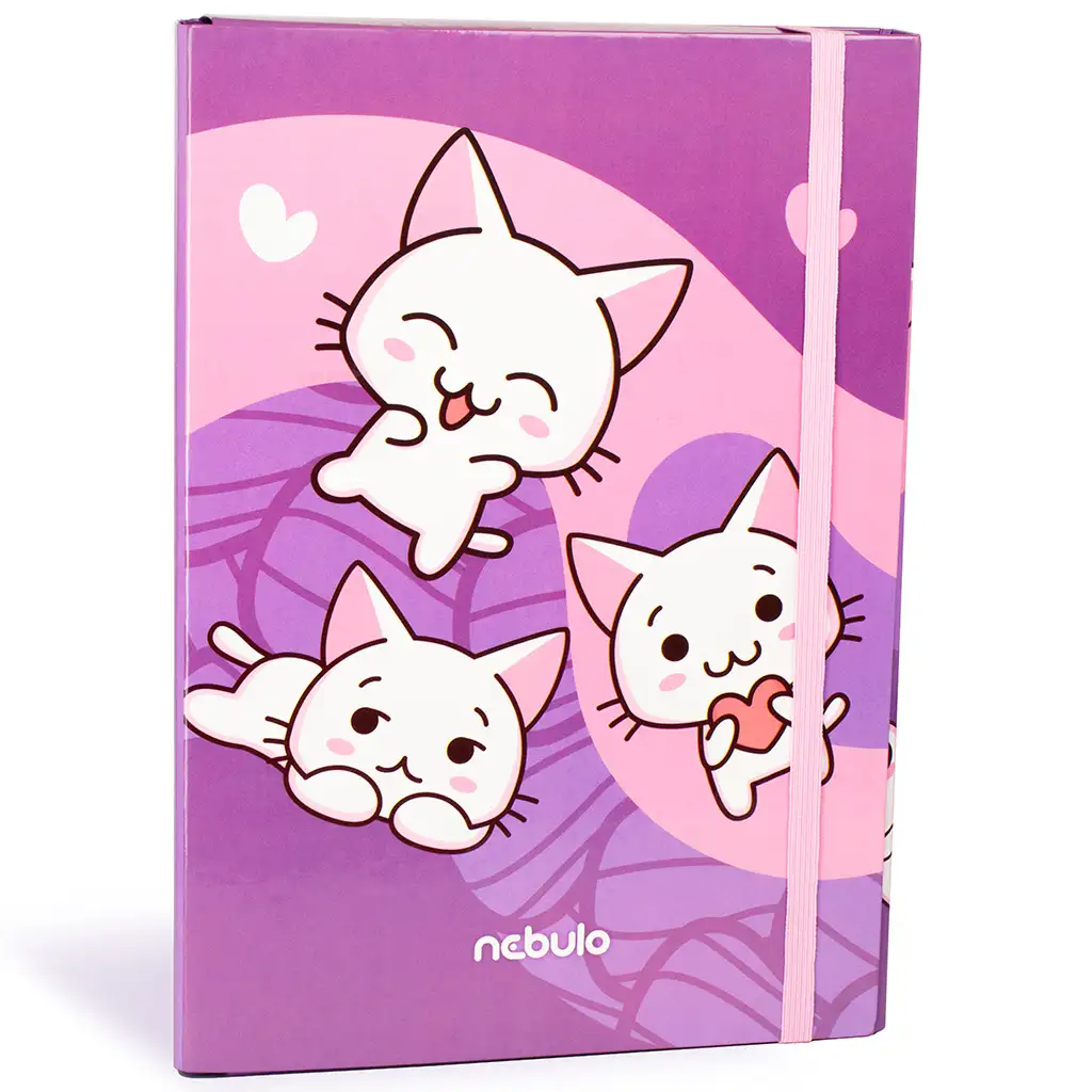 Questa scatola portaquaderni Nebulo formato A4 con gattini è il sogno di ogni piccolo amante degli animali! La copertina è decorata da tre dolci gattini bianchi sorridenti, su uno sfondo nei toni del rosa e del lilla, creando un look giocoso, adorabile e accattivante. Che si tratti di una bambina delle elementari che adora i gatti, o se semplicemente vuoi aggiungere un po di allegria alle giornate scolastiche, con questa scatola per quaderni farai sicuramente la scelta giusta.