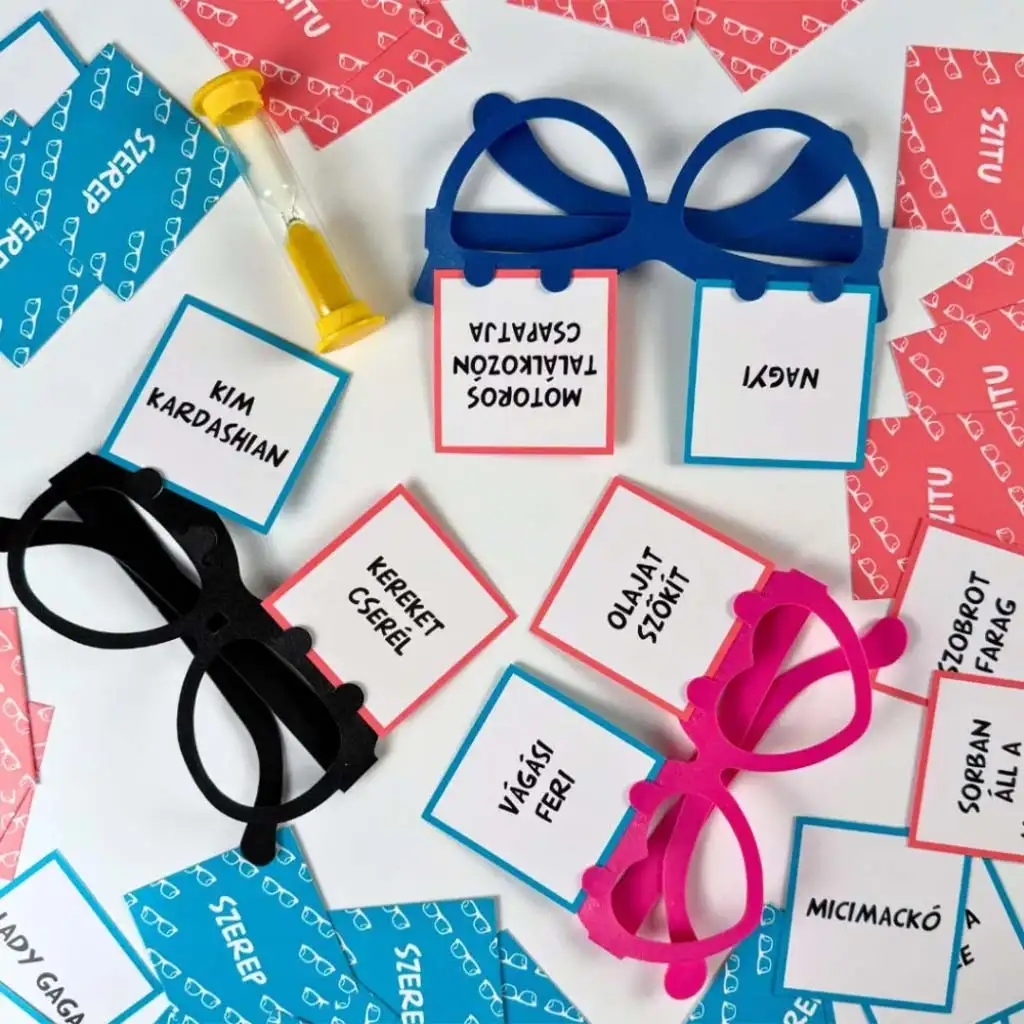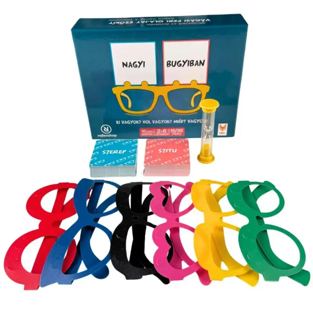 - Contenuto della scatola: 50 carte ruolo, 50 carte situazione, 24 carte vuote, 6 occhiali, 1 clessidra, 1 regolamento