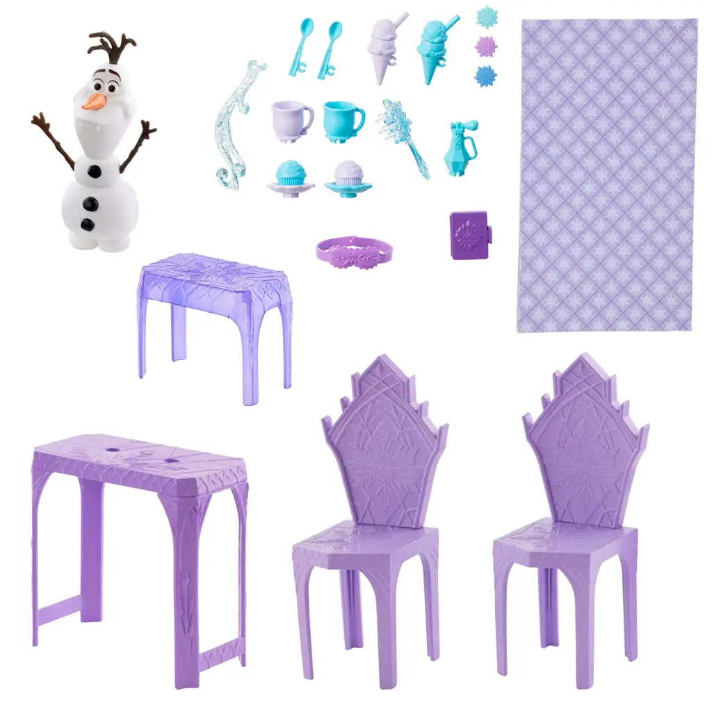 Il playset include più di 20 accessori, tra cui tavolo, sedie, coperta, gelato e cioccolata calda, così il gioco di ruolo è limitato solo dall’immaginazione. Le bambole Elsa e Anna (vendute separatamente) possono essere facilmente inserite nella storia, permettendo alle due sorelle di vivere insieme tutte le avventure. L’aspetto generale del castello e la scelta dei colori riflettono fedelmente l’universo di Frozen – con dettagli blu ghiaccio, viola e scintillanti.