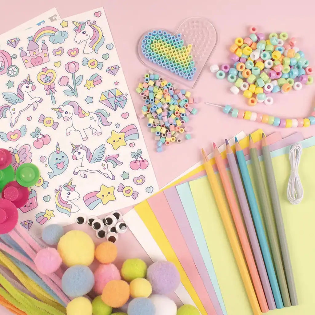 La confezione contiene fogli da disegno, adesivi, matite colorate, filo per infilare le perline, perline e tanti altri piccoli elementi che garantiscono un intero pomeriggio di creatività. È particolarmente adatto per feste di compleanno, pomeriggi con le amiche o semplicemente per una giornata creativa e tranquilla in casa.