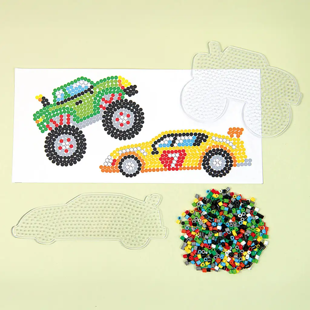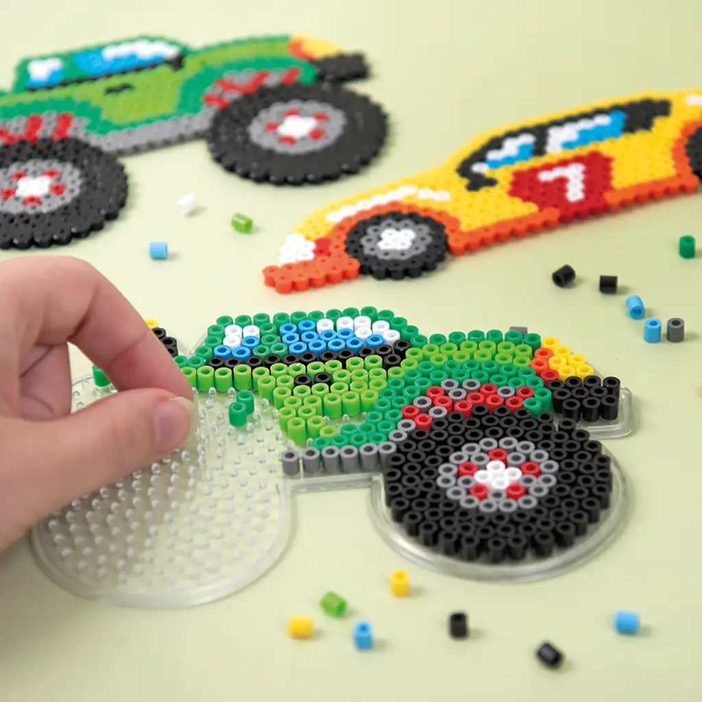 Disporre le perline favorisce la concentrazione, la destrezza manuale e il riconoscimento dei colori, offrendo così ai bambini un modo divertente per imparare. Le perline possono essere facilmente posizionate sulle sagome e, con l’aiuto di un adulto, fissate con il ferro da stiro, così da ottenere veicoli durevoli e resistenti che possono essere regalati o usati come decorazione.