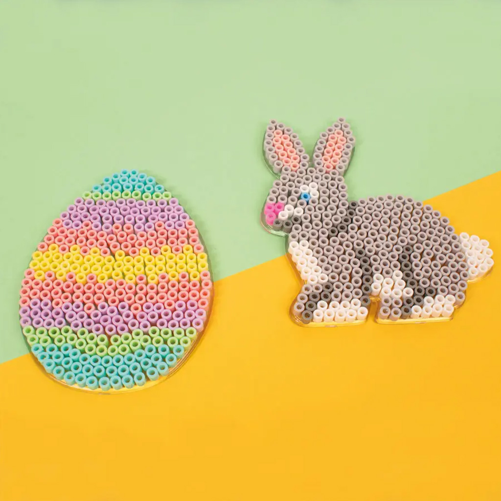 Le perline vanno semplicemente posizionate sui perni della piastra seguendo il motivo desiderato, poi stirate attraverso carta da forno. Con il calore le perline si fondono, creando opere durature e compatte. Le sagome sono ideali per realizzare motivi pasquali, uova colorate o simpatiche figure di coniglietto.