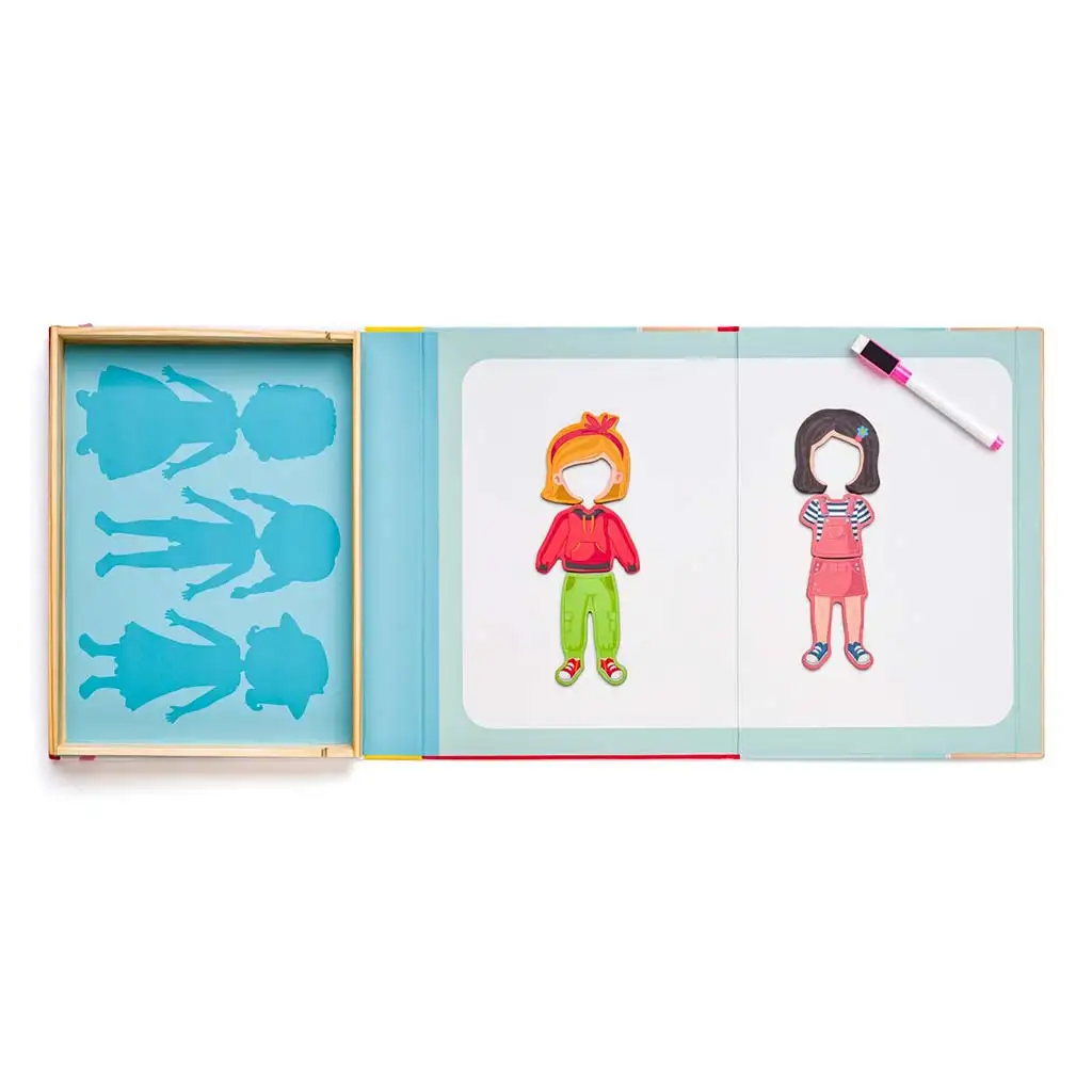 La scatola richiudibile a forma di libro offre una conservazione pratica, così i capi non si perdono ed è ideale anche per i viaggi. La lavagnetta magnetica interna fornisce una base stabile per creare, e con il pennarello cancellabile in dotazione puoi anche disegnare ulteriori dettagli intorno alle figure. Il gioco sviluppa la motricità fine, la creatività, lespressione di sé e la capacità di combinazione, intrattenendo il tuo bambino per molto tempo.