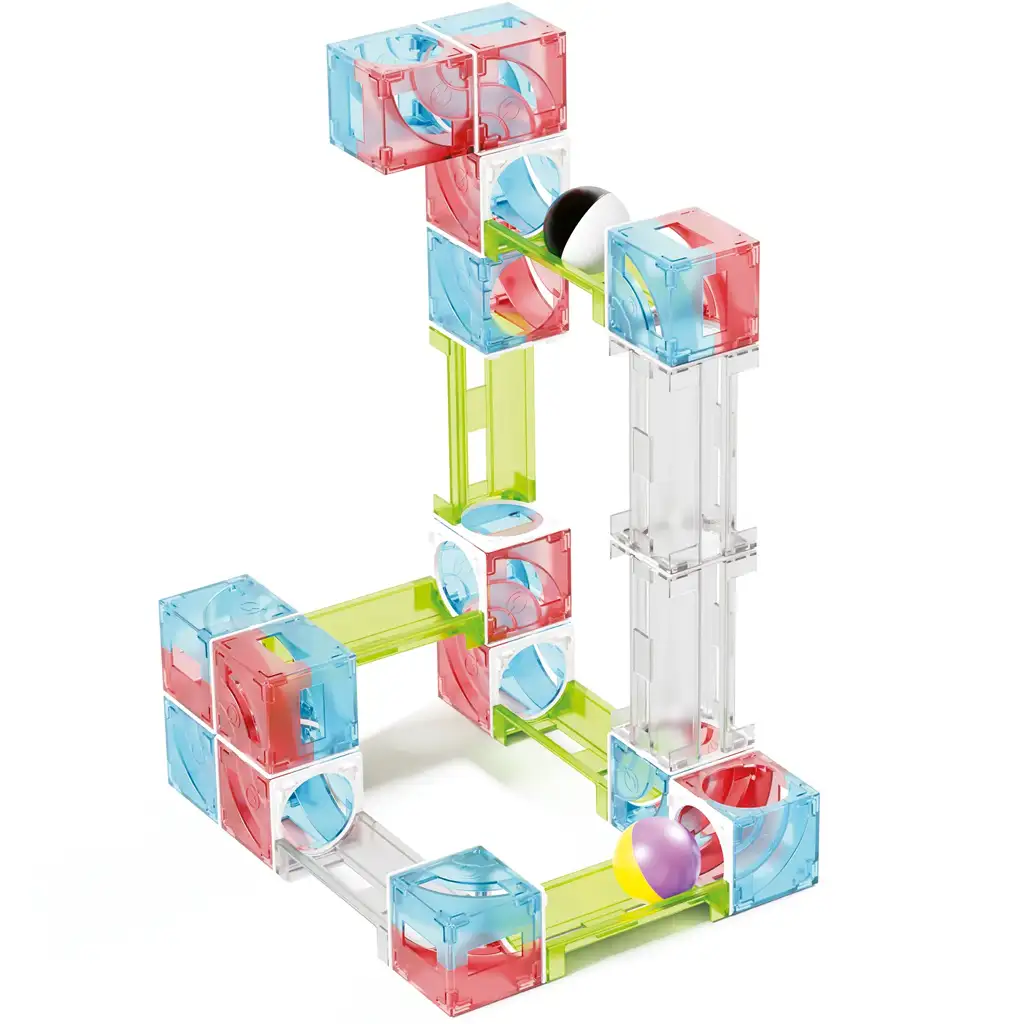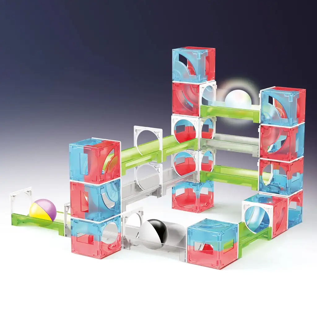 Il set include anche una biglia luminosa che si accende automaticamente in movimento, rendendo il gioco affascinante anche al buio. Le biglie sono di diversi colori e fantasie, offrendo anche unesperienza visiva stimolante. Gli elementi in plastica trasparente e di qualità si incastrano facilmente e i cubi colorati sono semplici da assemblare e smontare, anche per le mani più piccole.