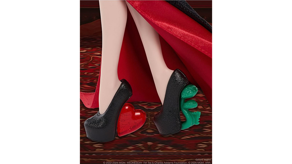 La bambola Morticia Addams è alta 28 centimetri e sfoggia un abito in velluto spaventosamente elegante, completato da maniche a campana, dettagli arricciati e una sottogonna in raso color porpora. I suoi capelli neri e lisci ricadono con eleganza sulle spalle, mentre il trucco viola, la manicure nera e i gioielli d’argento rendono il suo aspetto ancora più inquietante. L’outfit spettralmente raffinato è completato da un paio di scarpe nere con tacco alto: su una scarpa è presente una trappola per venere, sull’altra un cuore di vetro infranto come decorazione.