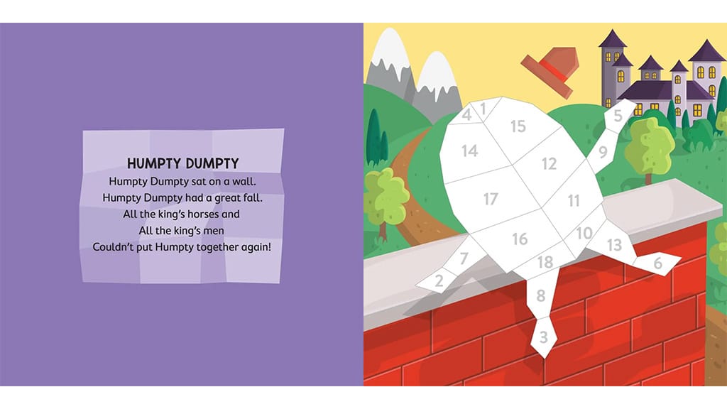 Questo libro da colorare con adesivi contiene classiche canzoni per bambini, come Humpty Dumpty, Jack and Jill, Hickory Dickory Dock e molte altre filastrocche conosciute. Nel libro si trovano 10 grandi immagini che anche le mani più piccole possono facilmente decorare con gli adesivi. Sul retro di ogni pagina si trova una poesia per bambini molto amata, così i più piccoli non solo possono creare, ma anche leggere o ascoltare le filastrocche. Questo libro è una scelta perfetta per i bambini in età prescolare, poiché sviluppa la motricità fine, la creatività e il vocabolario.