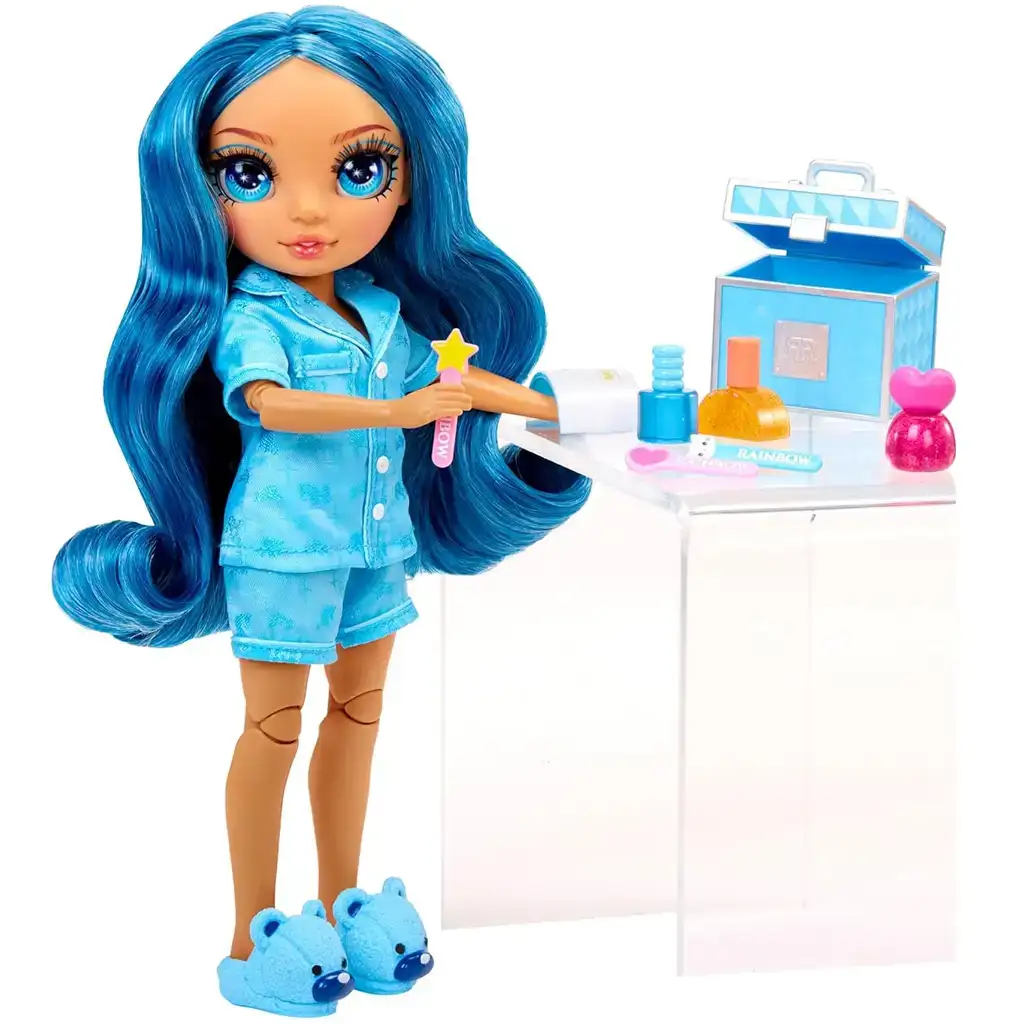 Skyler è una splendida bambola nelle tonalità del blu che incanta immediatamente i bambini con i suoi lunghi capelli blu ondulati e i brillanti occhi azzurri. Il suo pigiama è un trendy completo con pantaloncini decorato con piccoli loghi Rainbow High, che le dona uno stile davvero unico. Le morbide ciabatte pelose e gli accessori fashion inclusi rendono ancora più accogliente la festa del sonno.