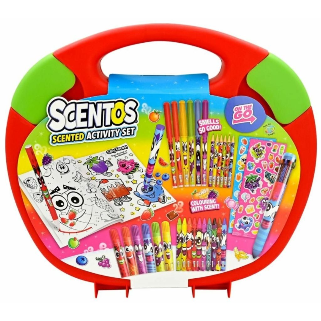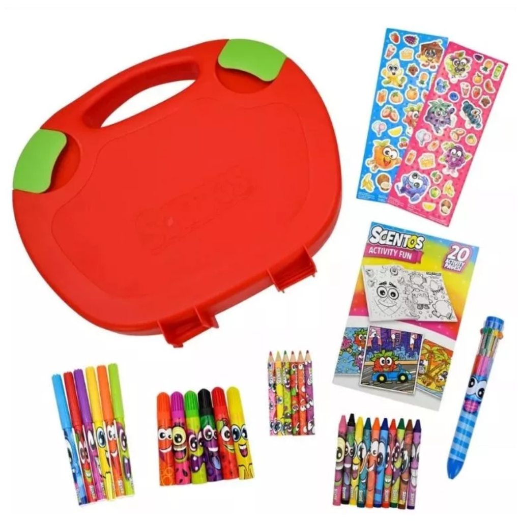 Il kit da viaggio profumato Scentos è un pacchetto creativo completo, progettato appositamente per creare durante gli spostamenti. La pratica valigetta con manico contiene tutti gli strumenti necessari, così i bambini possono disegnare e colorare liberamente ovunque – in auto, in vacanza o mentre aspettano. La particolarità è che tutti gli strumenti hanno una delicata fragranza fruttata, che rende lattività creativa ancora più piacevole.