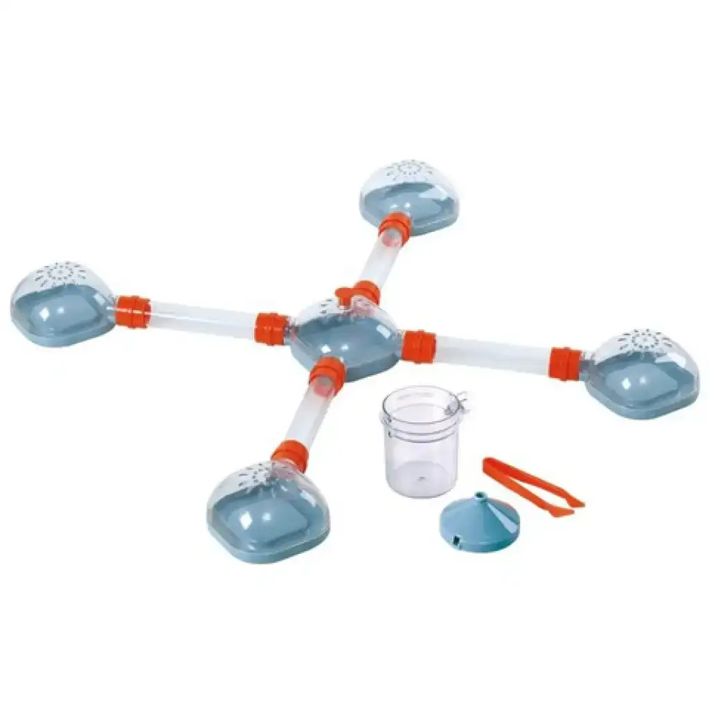 Anche gli insetti vivono in società speciali, e forse il miglior esempio è fornito dalle formiche o dalle api, dove esiste un serio sistema di caste, poiché una regina governa, ci sono individui lavoratori e naturalmente guerrieri, quindi ognuno ha il proprio compito, proprio come nel mondo umano. Ora, tuttavia, cè lopportunità di esaminare un po il mondo degli artropodi grazie a questo straordinario osservatore di insetti. Stazione di osservazione degli insetti con 5 camere di osservazione, pinzette e bicchiere di raccolta. Ogni camera è dotata di un coperchio ventilato, i coperchi sono trasparenti. Il coperchio a forma di imbuto del bicchiere di raccolta può essere collegato alla camera centrale, e grazie alla chiusa presente nel bicchiere di raccolta, il piccolo essere catturato può essere facilmente e in sicurezza trasferito nella camera centrale. Alla camera centrale sono collegate le quattro camere esterne tramite un corridoio trasparente.