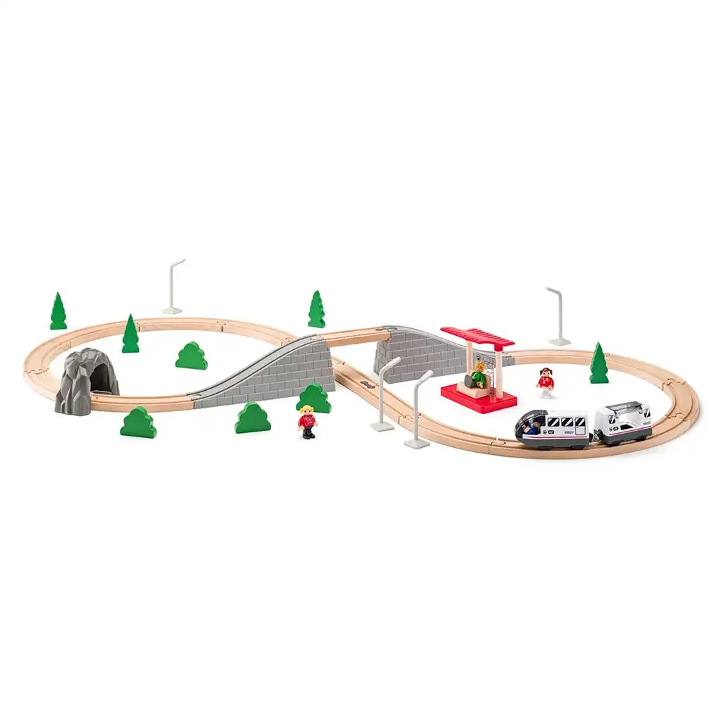Questo set ferroviario è la scelta perfetta se il tuo bambino ama i treni e le scene realistiche. Il moderno treno passeggeri a due carrozze corre lungo il binario, attraversa una galleria, passa su un ponte e si ferma alla stazione coperta dove i passeggeri stanno già aspettando. Il tracciato, progettato con cura, rende il gioco vario grazie a entusiasmanti dislivelli e curve.