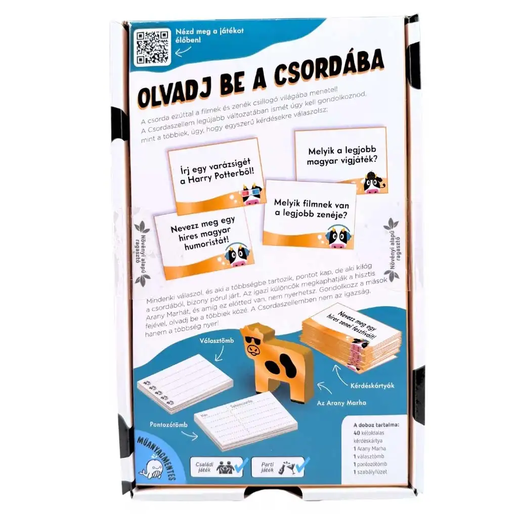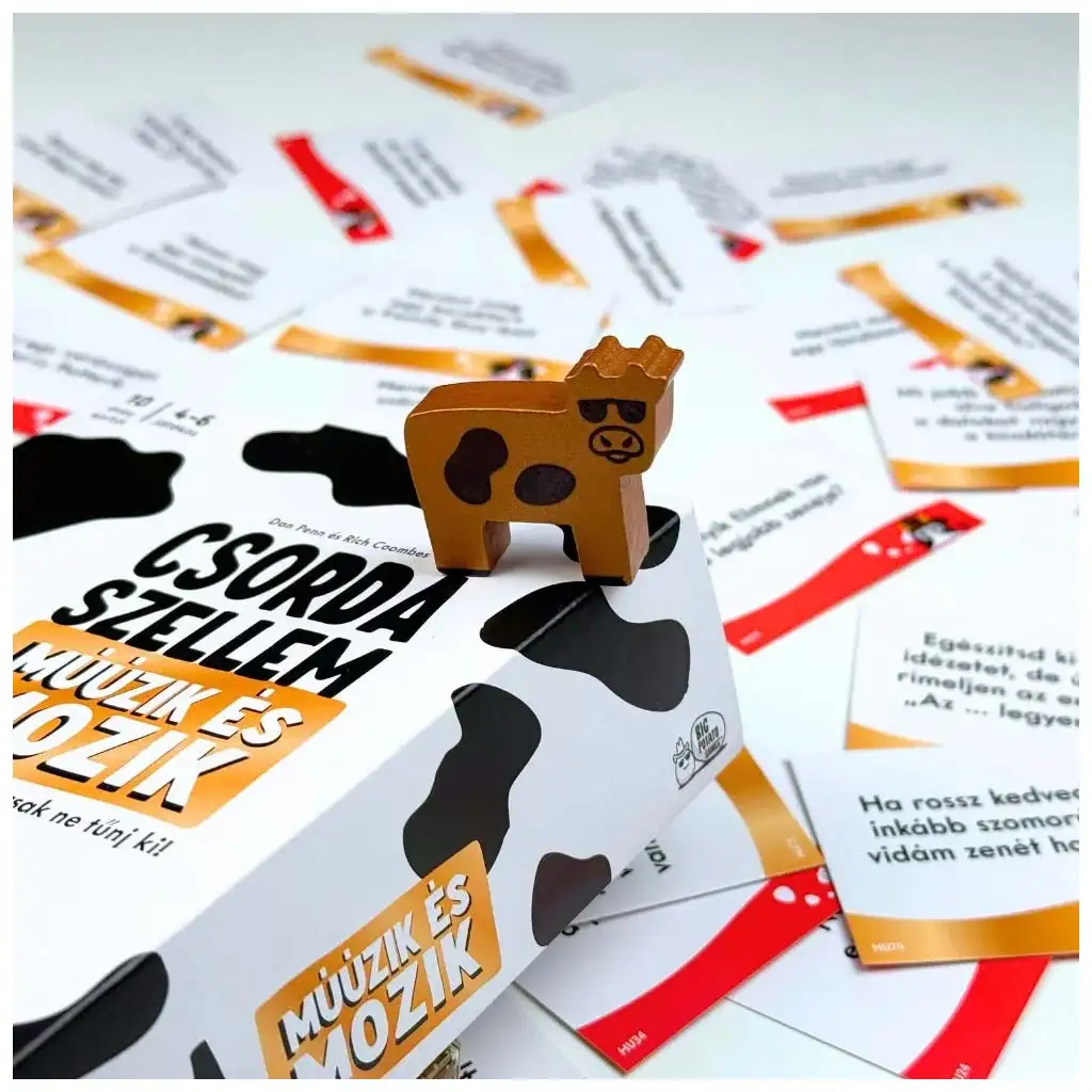 Spirito di Mandria – Muu’sica e Muuvie è un gioco di società frenetico e pieno di risate, che questa volta porta i giocatori nel mondo dei film e della musica. L’obiettivo resta geniale nella sua semplicità: devi pensare come la maggioranza. Non conta qual è la risposta giusta, ma se riesci a indovinare l’opinione della maggior parte dei partecipanti.