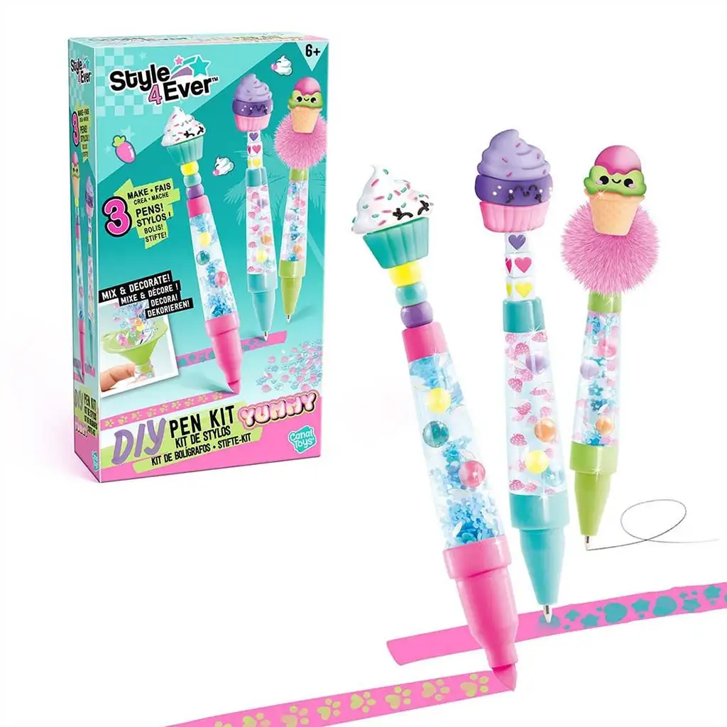 Libera la creatività di tuo figlio con il set Style 4 Ever DIY Fai da te Penne, che non è solo un passatempo divertente, ma anche educativo! Questo magico kit permette ai bambini di creare penne uniche e personalizzate, decorate con simpatici animali o deliziosi motivi a tema dolci. Il set contiene tutti gli accessori necessari per realizzare tre penne completamente personalizzabili, inclusi perline colorate, glitter, decorazioni soffici e terminali speciali come testa di gatto, gelato o zampetta.