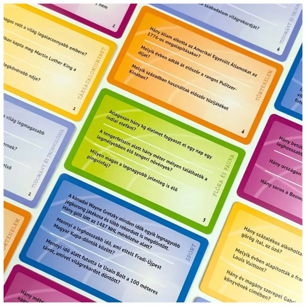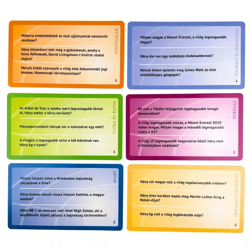 Velocità, anni, lunghezze, pesi, record — un sacco di dati interessanti e fatti sorprendenti emergono durante il gioco. In totale vi aspettano 1188 domande in sei categorie: società, natura, scienza, storia, sport e molti altri entusiasmanti ambiti. Il gioco collettivo con le ipotesi, le discussioni e le scommesse crea unatmosfera speciale, mentre imparate senza accorgervene. Scelta perfetta per serate in famiglia e ritrovi con amici, dove risate e sana competizione sono garantite.