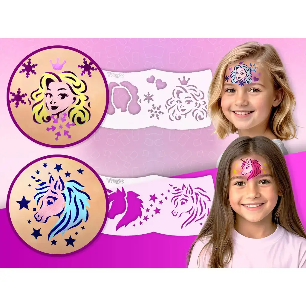 TyToo: Il mio primo set per il trucco per il viso – Princess & Unicorn è la scelta perfetta se vuoi introdurre il tuo bambino nel magico mondo del face painting. Grazie agli stencil a tema principessa e unicorno potrai creare splendidi disegni anche se non hai esperienza. Basta posizionare lo stencil, usare la spugnetta o il pennello in dotazione, e il mondo fiabesco scintillante sarà pronto sui piccoli volti!