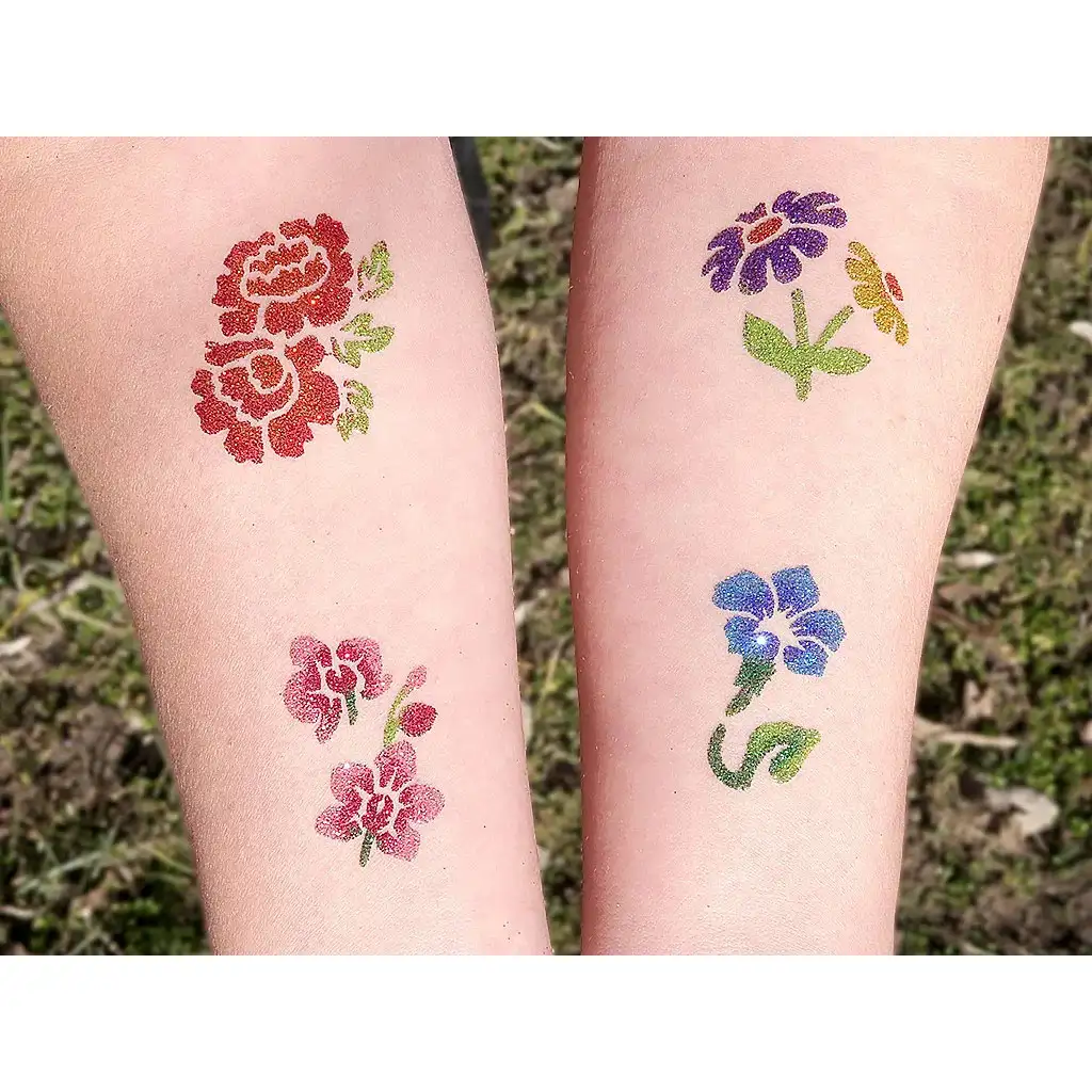 I glitter, delicati sulla pelle e di qualità cosmetica, aderiscono perfettamente e, se usati correttamente, possono rimanere sulla pelle anche per diversi giorni. Che si tratti di motivi floreali, farfalle o soggetti da supereroe, con questo kit ognuno troverà il suo preferito. Le polveri coprono bene, brillano intensamente alla luce del sole e rendono i tatuaggi davvero spettacolari. Inoltre, sono semplicissime da usare: basta un po’ di colla, uno stencil e il divertimento può iniziare!