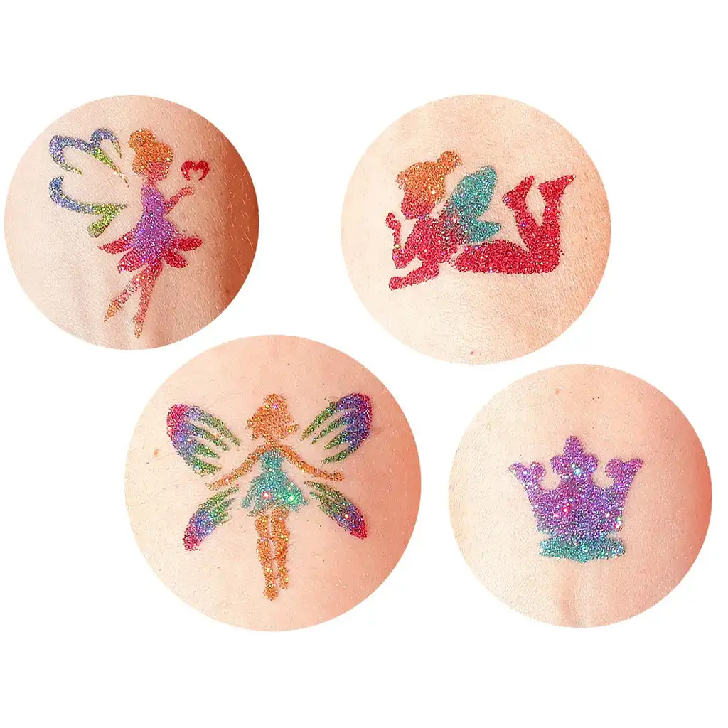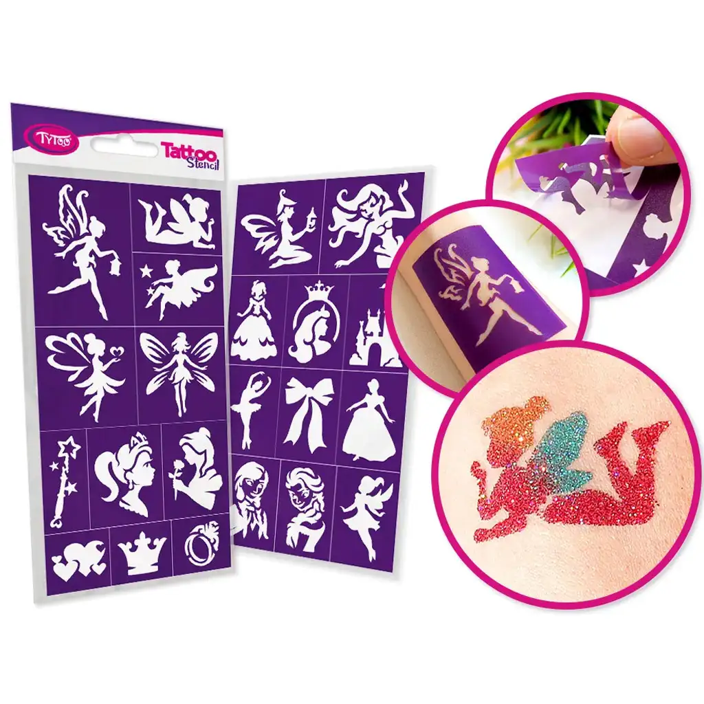 TyToo: Set di stencil per tatuaggi glitterati fate e principesse, 22 pezzi