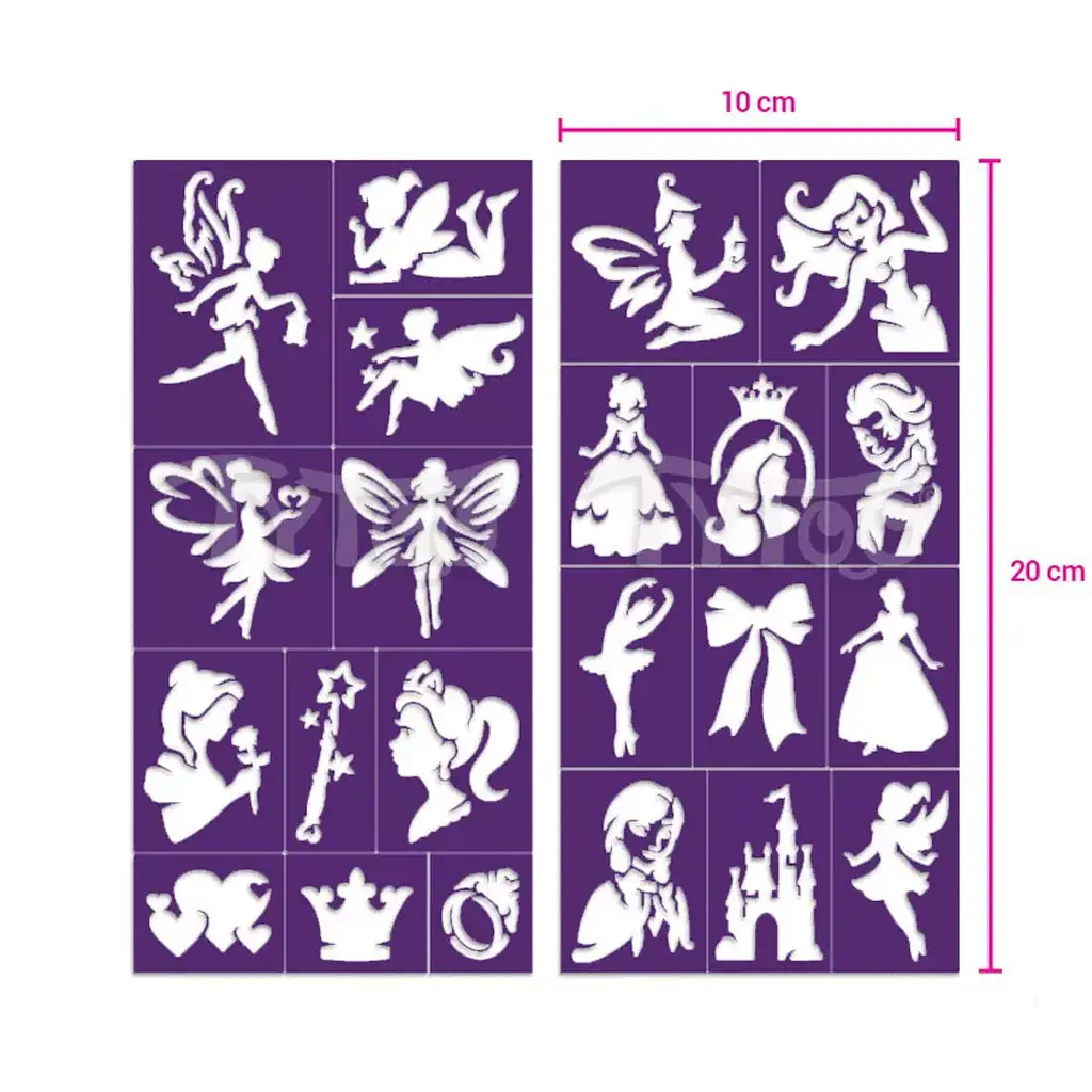 I disegni sono ricchi di dettagli e vari, dalle classiche sagome di fate, alle corone, fino alle silhouette di abiti da ballo. Gli stencil possono essere riutilizzati più volte, offrendo così un divertimento non solo creativo, ma anche economico. Il loro utilizzo sviluppa la manualità e ispira la fantasia dei bambini, garantendo allo stesso tempo momenti di qualità insieme.