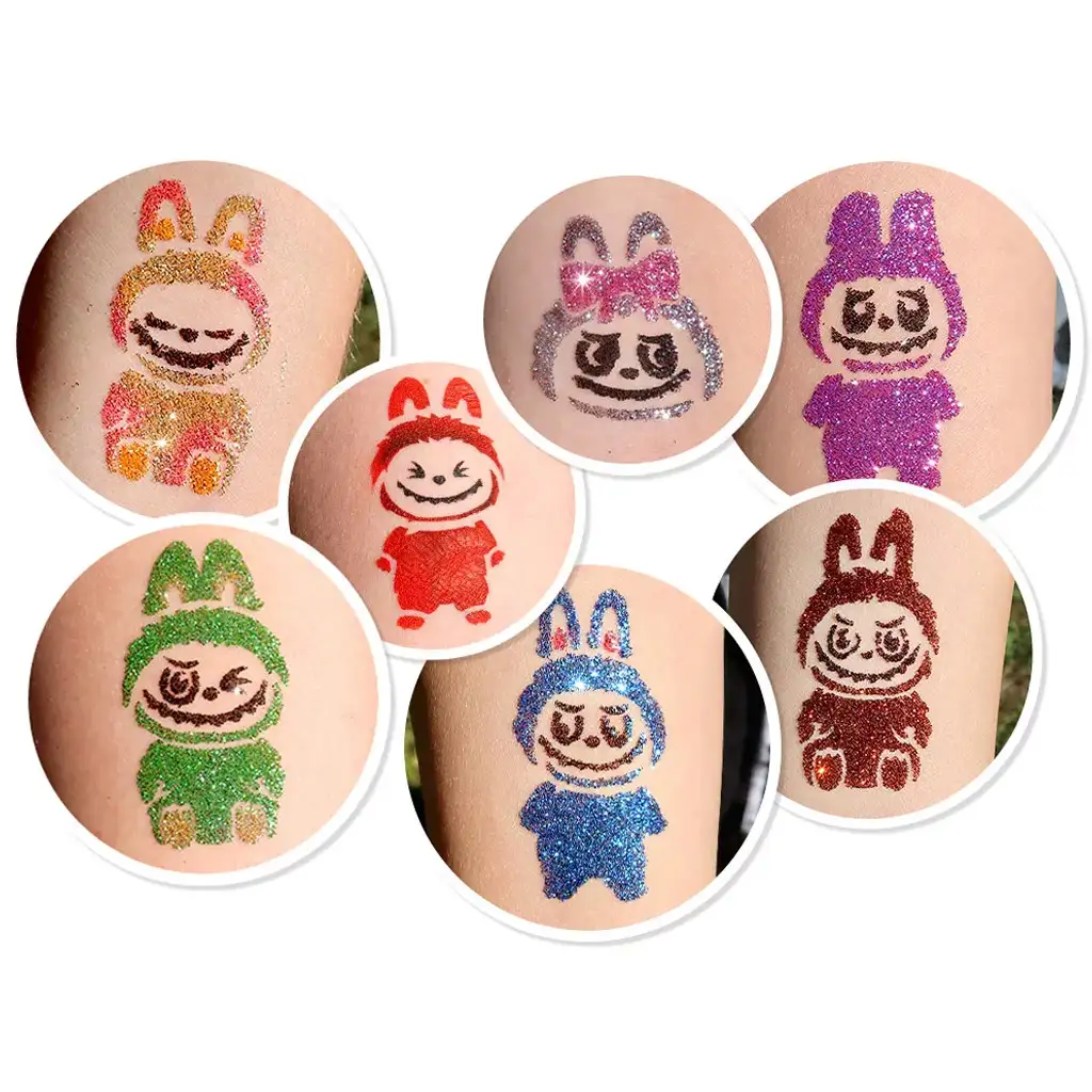 Il loro utilizzo è estremamente semplice: basta staccare lo stencil, applicarlo sulla pelle, stendere la colla e cospargere con il glitter scelto. In pochi istanti il tuo colorato e luccicante personaggio Labubu sarà pronto! Gli stencil sono riutilizzabili con la dovuta attenzione, così potranno essere usati più volte durante le attività creative.