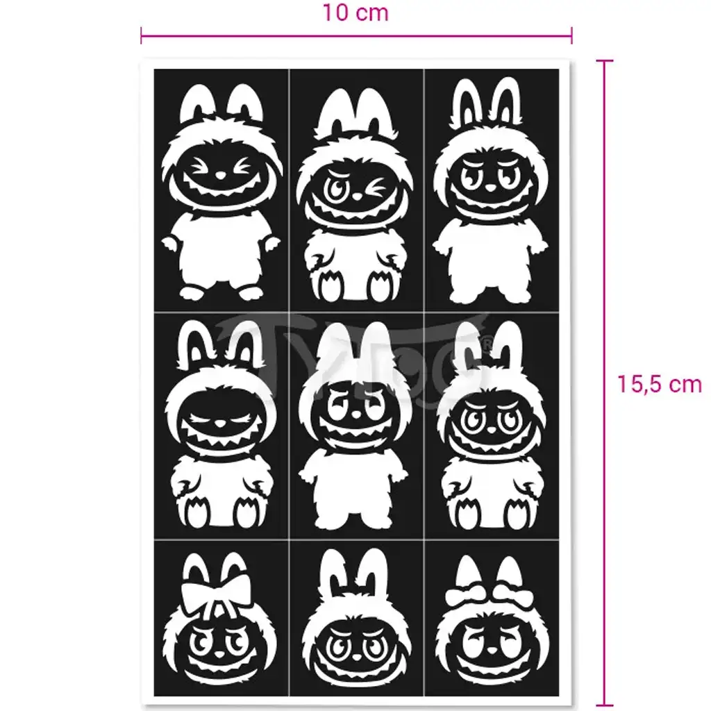 Se tuo figlio ama i personaggi unici, un po’ divertenti e un po’ ribelli, il set di stencil per tatuaggi glitter TyToo Labubu diventerà sicuramente il suo preferito! Questo pacchetto di 9 stencil porta i popolari personaggi Labubu travestiti da coniglietto, che, decorati con polvere glitter, si trasformano in veri tatuaggi magici.