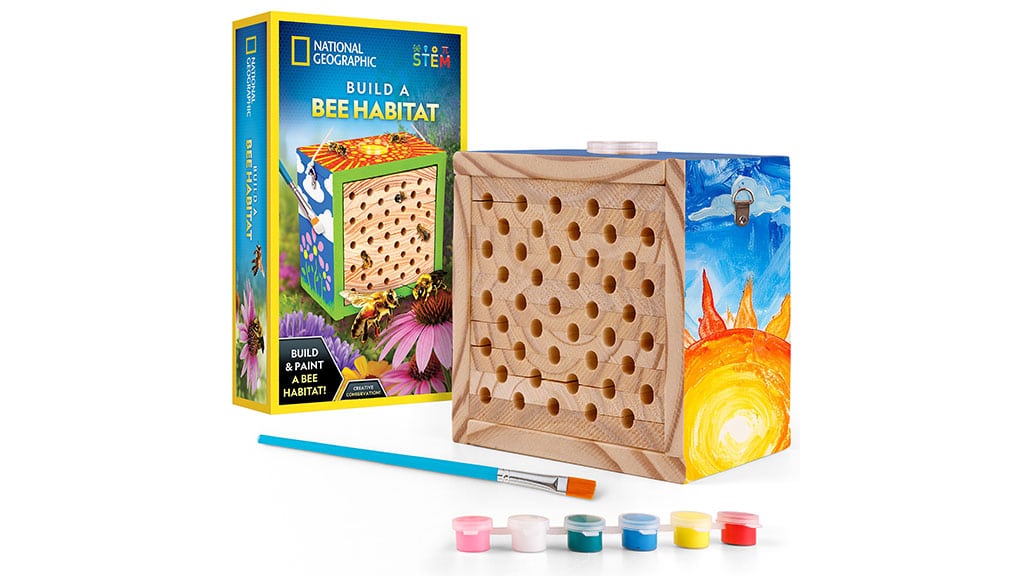 Il Blue Marble National Geographic Set Creativo per la Costruzione dell’Habitat delle Api Solitarie contiene tutto ciò di cui i bambini hanno bisogno per costruire una solida casa per le api solitarie. Le famiglie possono assemblare facilmente la casetta in legno con l’aiuto di un cacciavite (non incluso nel set). Successivamente, con le vernici, il pennello e gli adesivi inclusi, possono decorare il set a piacere, così ognuno può creare un hotel per api unico e colorato. Quando l’habitat è pronto e ben decorato, i bambini possono appenderlo all’aperto e osservare come le api solitarie si trasferiscono nella loro nuova casa. Il set include anche un diario di osservazione, dove i bambini possono annotare il comportamento delle api, le loro osservazioni e persino disegnare la vita quotidiana delle api. Questo set non solo è divertente, ma educa anche alla consapevolezza ambientale, sviluppando al contempo la manualità e la creatività.