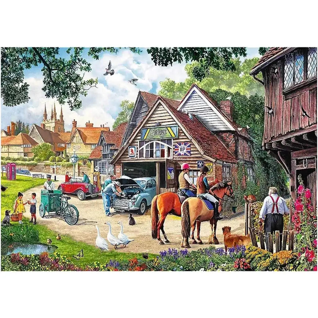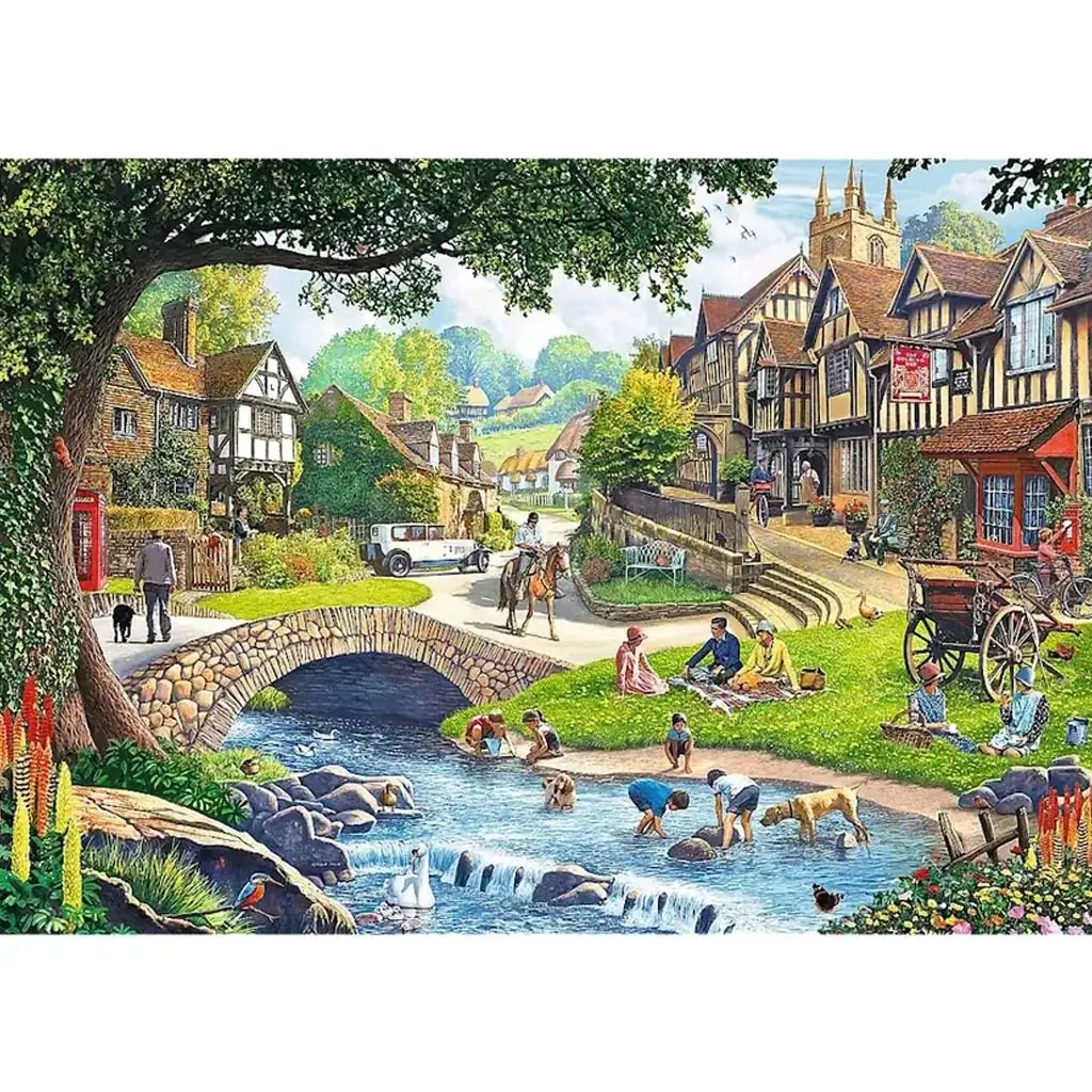 La scatola racchiude due scene diverse ma armoniosamente coordinate. La prima raffigura il vivace centro di un villaggio, dove le persone arrivano a cavallo al classico garage, mentre sullo sfondo le bandiere britanniche, le auto d’epoca e gli edifici caratteristici richiamano l’atmosfera degli anni ’50. La seconda scena mostra un tranquillo picnic soleggiato sulle rive di un piccolo fiume, dove i bambini giocano nell’acqua, gli adulti conversano sull’erba e, sullo sfondo, il villaggio si estende placido.