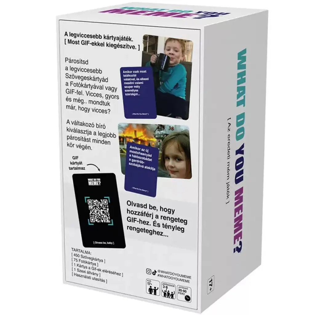 What Do You Meme? – GIF Edition è un gioco da tavolo divertente e creativo per adulti, in cui la protagonista assoluta è la risata. Lobiettivo del gioco è abbinare carte di testo divertenti alle foto o alle GIF animate fornite. A ogni turno, i giocatori scelgono una carta di testo da abbinare a unimmagine o a una GIF, in modo che la combinazione sia il più divertente possibile. Il giudice del turno decide quale sia la combinazione migliore, e quel giocatore guadagna un punto.